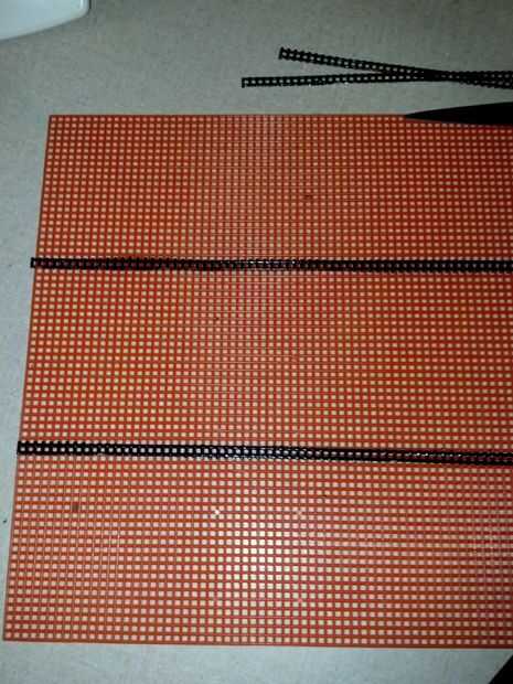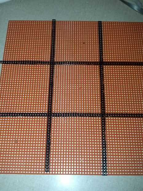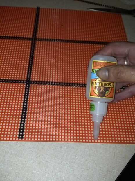 Vamos a aplicar las tiras negras por pegar la primera tira de 3 pulgadas de la parte superior y horizontal. Baje de 3 pulgadas y pegar otra tira de esa misma manera. Para secar y hacer esto a cada color cuadrado. Después de esto, vamos a repetir lo que era juat hecho pero verticalmente. Cuando haya terminado, usted debe tener cada uno de sus cuadrados divididos en 6 cuadrados de 3 pulgadas.
