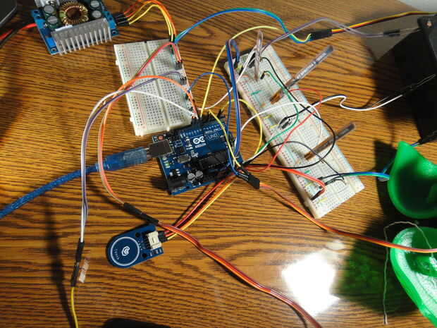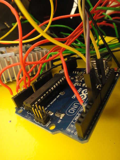 El cable de señal para el teclado entra en uno de los pines digitales, mientras que los sensores de flexión se colocan en los pines analógicos [pero no antes de coloca una resistencia en serie--ver la diversión de la chispa enlace para más claridad].