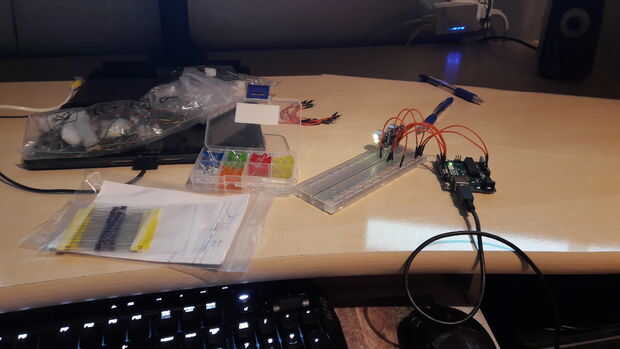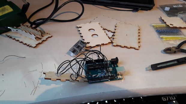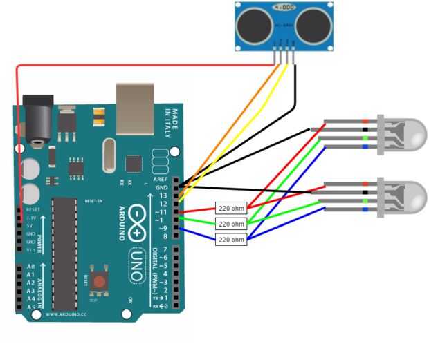 Para la electrónica usé 2 RGB LED con resistencias de 3 220 ohmios. El led se suelda en una configuración paralela como se muestra en el diagrama incluido. Elegí a soldar los cables directamente a la cabecera del sensor de ultrasonidos. Para conectar los cables en un arduino he utilizado algunos encabezados hombres y soldado todos los cables a los terminales correctos: la zona de patillas soldada como sigue; El gatillo es soldada a pin 13, el eco al pin 12, el rojo annode a 11, el annode verde a 10 y la annode azul a 9.