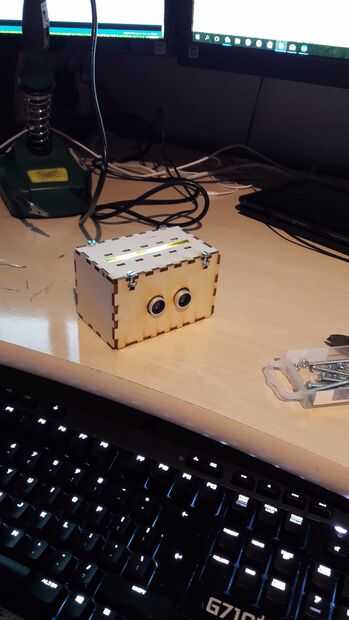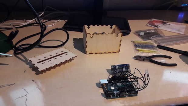 Usted debe combinar y pegue las dos piezas de la carcasa por separado, hay zona t en forma de agujeros que tienen que hacer frente hacia arriba para que los pernos un tuercas pueden ser insertados más adelante. La parte superior está lista para la inserción de led. Poner los LEDs en los agujeros taladrados por lo tanto. A continuación comencé la Asamblea total poniendo el cable de alimentación a través del agujero y conectarlo al arduino, caus sería mucho más difícil hacerlo más adelante en el proceso. A continuación bajé el arduino y resbala el sensor de ultrasonidos en su lugar designado. Luego fue hora de cerrar la tapa, cerfully poner la tapa y fijarlo con las tuercas y los pernos en la parte superior.