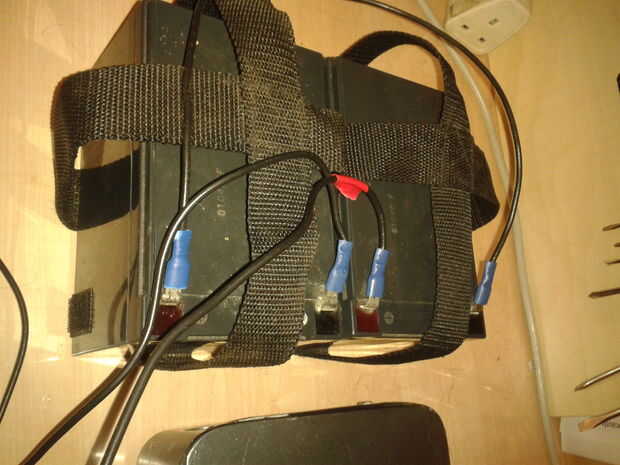 He optado por usar 24 voltios, esto es debido a tener pilas 2 * 12 voltios, y tengo algunos LED que están diseñadas para ejecutarse directamente en 8-48 voltios. Este las baterías están conectadas en serie para crear los 24v, (teniendo cuidado de polaridad). He hecho algunos cables para arriba con las espadas en que empujaron a la batería, esto hará que sea fácil cambiar las pilas si es necesario.