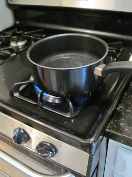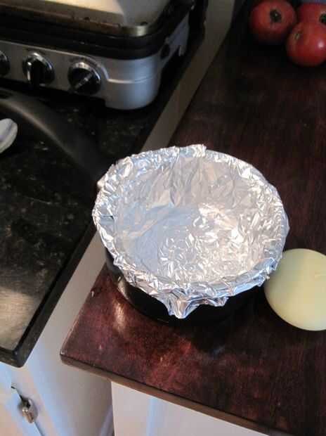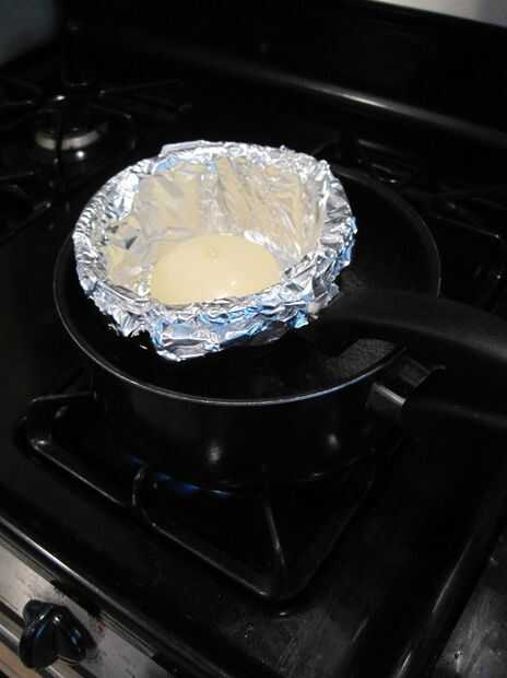 En este paso, usaremos un baño María para derretir la cera. Usando una caldera doble es ideal cuando se desea una distribución de calor muy uniforme y no quemar lo que sea que intenta fundirse como cera o chocolate. Tengo la olla más grande con agua y comenzó a hervir mientras preparé el bote más pequeño con papel de estaño para acelerar la limpieza más tarde. Una vez que se hizo poner el bote más pequeño en la ebullición olla y poner la cera en para iniciar la fusión.