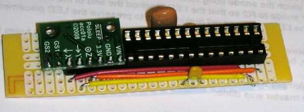 Prueba a todas las ensambladuras para conectividad y pantalones cortos. Si los controles del tablero esta lejos, que están listos para el acelerómetro. Si no, empezar con un nuevo tablero y piezas. Errores en este punto Obtén caros. GS2 corto en acelerómetro mediante la adición de un puente entre los dos agujeros marcados GS2. Esto proporciona una sensibilidad media de más o menos 4 Gs. Desafortunadamente, no hay suficiente espacio en el manillar que utilice el puente suministrado.