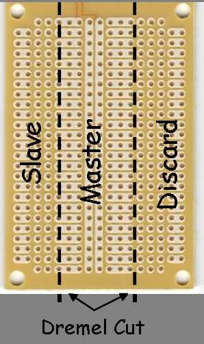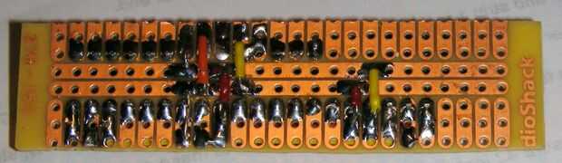 – El oscilador es un pedazo grande que apenas cabe en mi bar. Para un mejor ajuste, los conductores en Osc1 son recortados para que descansen en el tablero. Recorte las muescas, para que la base del oscilador se desliza hasta la Junta. Coloque Osc1 junto a los pines 9, 10 y 11 en el zócalo (cualquier dirección está muy bien). Suelde el PIN1 de Osc1 para conectar al PIN9 del encaje. La soldadura de un puente, compartiendo el agujero con el PIN2 medio de Osc1 para el carril de tierra. Finalmente, el plomo sin cortar de PIN3 de Osc1 y PIN10 del encaje del arco juntos y les de la soldadura tanto en lugar.