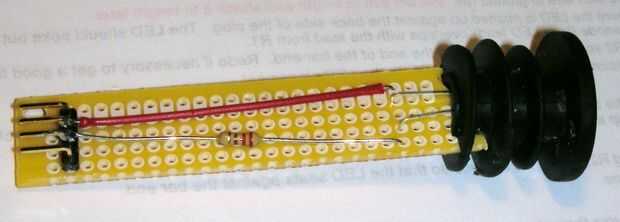 Como con D1, inserte D2 la barra tapón hasta que se detenga. Introducir el PCB en la raja y el LED lidera para que lleguen los agujeros adyacentes a la sin plomo de cables R2 y puente de la curva. Soldar en su lugar.