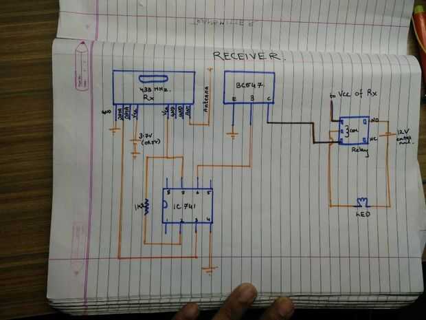 Utilizamos el 433 MHz Rx para recibir la señal transmitida. Cuando se transmite una lógica 1 recibimos una lógica 1 pero cuando enviamos a lógica 0, esperar una lógica 0 pero eso no es el caso tenemos algún voltaje aproximadamente 2 voltios por lo tanto usamos un opmap ic como comparador y la abrazadera del voltaje recibido lógica cero a 0V. ahora la salida del opamp que IC es no proporcionar suficiente corriente para conducir el relé por lo tanto usamos un transistor actuando como un interruptor. Cuando la corriente de base es cero, el transistor actúa como un abierto interruptor y no deja ic actual para fluir. Cuando la corriente de base el transistor actúa como un interruptor cerrado y proporciona una ruta para ic actual fluir. La base del transistor está conectada a la salida del opamp circuito .el emisor está conectado a tierra y el colector se conecta al relé como una carga. El relé actúa como una red de conmutación para conducir grandes lámparas o luces según su deseo.