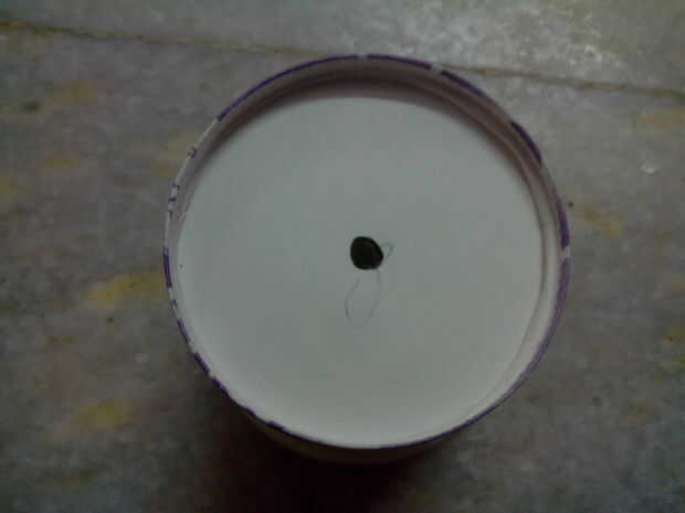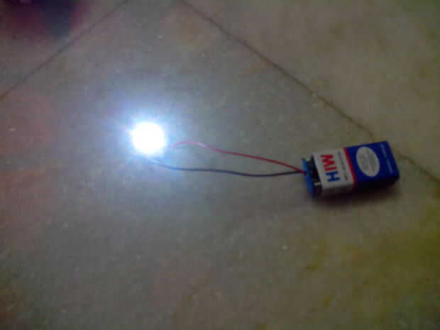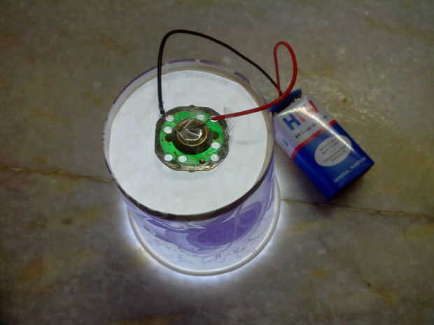 conectar el LED con la batería, hacer un orificio en la taza de papel luego coloque el LED