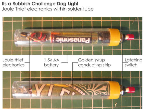 Corte una tira de la lata de oro jarabe para las conductoras de la tira para pasar de la batería al interruptor de bloqueo en el otro extremo. Encontré que cable era demasiado grueso para pasar la batería y la bandeja funciona bien. Como un bono de la gráfica en la lata es tan encantador que añade interés a la luz.