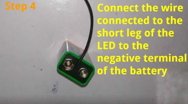 Paso 4: Conecte el cable conectado a la pata corta del LED al terminal negativo de la batería.