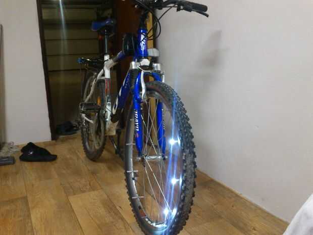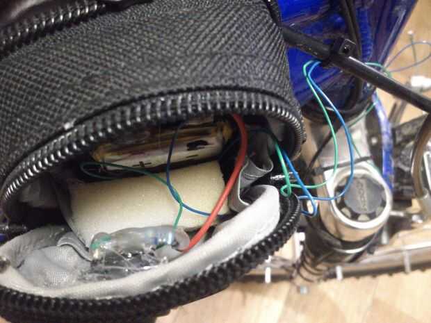 Ahora es el momento de elctronico todos juntos. Tomar un alambre y soldar un extremo a uno de los módulos de LED, luego ejecute el alambre en el rayo más cercano. Use pegamento para mantenerlo en su lugar. Al otro lado del alambre es soldado a un clip. Para determinar cuál, gire la rueda en una posición donde el módulo es en la posición donde debe arrancar iluminación. Encontrar el clip que está empezando a tocar la almohadilla conductora y y soldar el cable a ese clip. El terminal positivo de la batería se conectará a la plataforma de la serie con el resistor de 5,6 ohmios e interruptor on/off. Terminal negativo debe estar conectado a la rueda. conexión a un marco no será suficiente puesto que los rodamientos no proporcionan buena conexión eléctrica. Ya que pienso montar el anillo en un lado de la rueda, todavía tengo habitación en el otro lado así que decidí montar el terminal negativo de allí. La Asamblea es sólo improvisado tornillo apretado con la tuerca y la pieza de metal que hace contacto con el eje de la rueda. Puede utilizar clip para realizar esta conexión. He conectado los cables a la almohadilla y el tornillo improvisado y funcionó encima de la horquilla al lado del volante donde tuve bolsa. rellenos de batería, interruptor y resistencia en ella. Cantidad generosa de pegamento asegura que las conexiones no se romperán y espuma evita que todo movimiento interior.