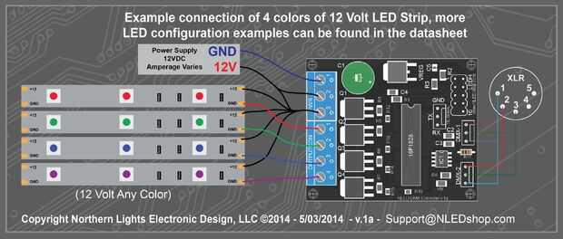 NLED 4 canales DMX controlador de lavado es muy fácil de usar. Todas las necesidades del usuario es el controlador, una fuente de alimentación de 12 voltios y 1-4 colores/grupos/canales de cualquier tipo o configuración de LEDs. Tira de LED RGB de 12 voltios es la más común, pero tira LED RGBW también está disponible. O el usuario puede utilizar múltiples bandas de solo color LED, lo que se requiere.