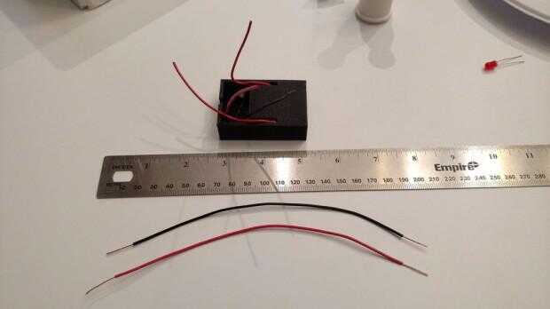 1. Usted necesitará un cable de 200mm de color rojo pelado en los extremos y un segundo alambre de la misma longitud en negro.