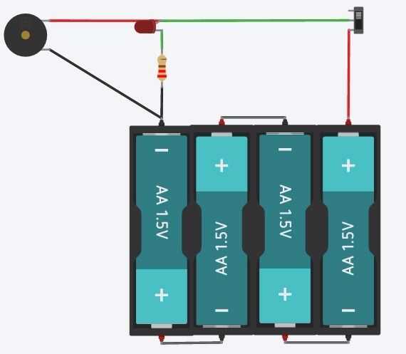 2. Añadir el zumbador en el LED y el Resistor. El zumbador está ahora en un circuito en paralelo para el LED y el Resistor. El zumbador se conecta al ánodo o al (+) del LED y el otro extremo está conectado al borne negativo (-) de la batería. Anteriormente nos mostró una serie esquemática. Este diagrama muestra ahora el zumbador es paralelo al LED y el Resistor. ¿Puede ver las líneas paralelas en el diagrama?