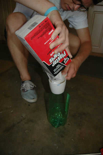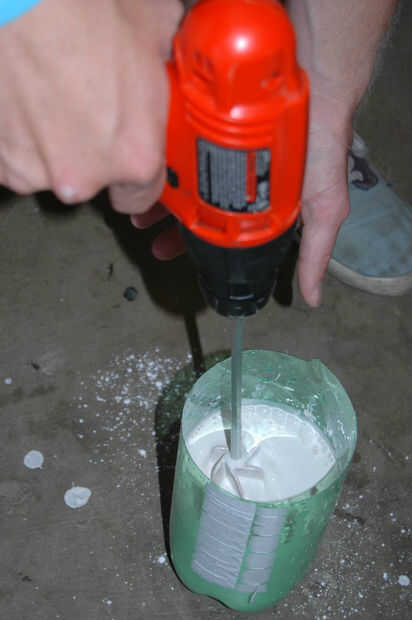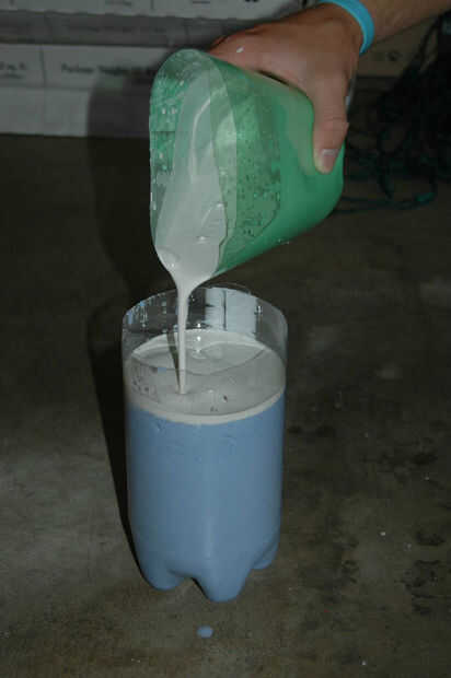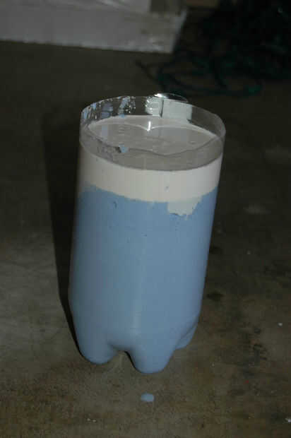Mezclar el yeso y agua en un recipiente separado y comienzan a verter en el molde. Usted querrá poner alrededor del 25% en un momento y golpee ligeramente el molde entero en el suelo para eliminar las posibles burbujas de aire. Continuar vertiendo hasta que estés feliz con el grueso de su base de su lámpara de mano. La ventaja de utilizar una botella de refresco de 2 litros es que proporciona una excelente base de partida para su lámpara de mano.