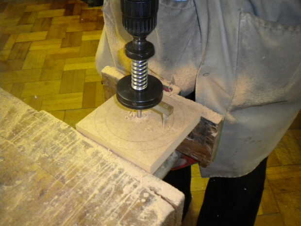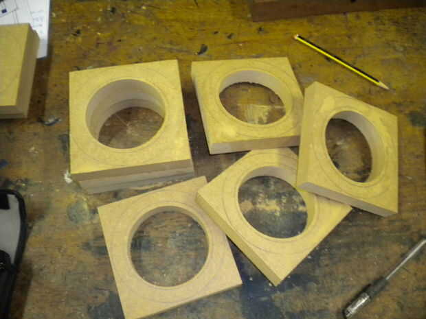 • Utilizando un orificio ajustable Sierra / Fly cortador de crear un agujero de Ø100mm en todas las capas de MDF