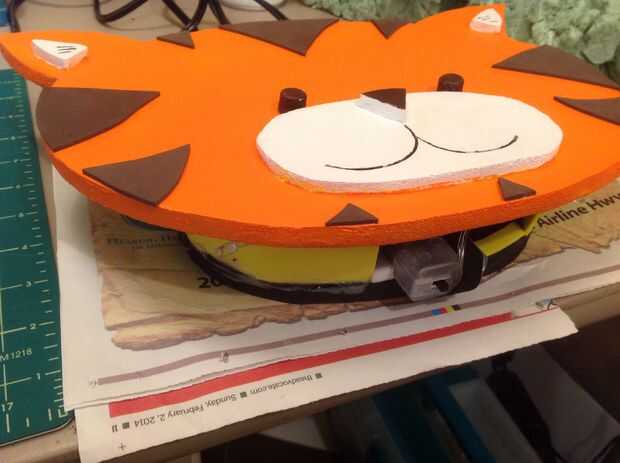 Cepillo de espuma en una capa de Mod Podge para sellar. Pintura naranja de cara, boca y orejas blancas, nariz, rayas y los ojos marrones. Dejar secar completamente y luego sellar con Mod Podge. Aplique cemento de contacto en línea en la parte posterior de la cara de tigre, fije a la parte inferior.