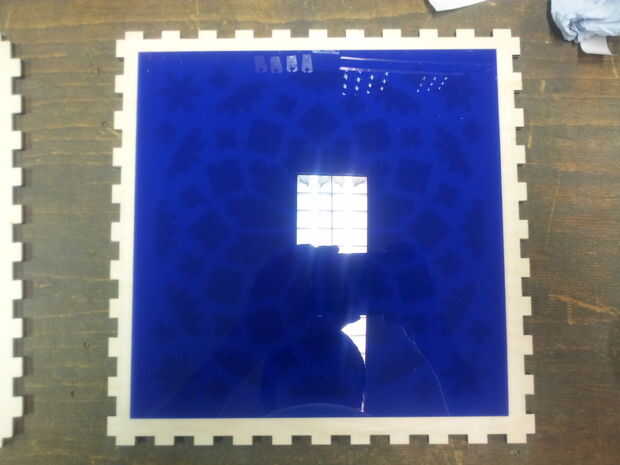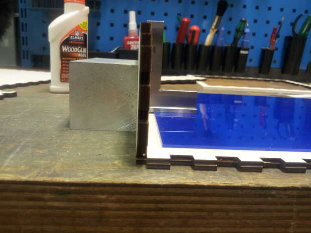 Aplique una capa delgada de pegamento para madera en la superficie interior del panel exterior. Utilizando las piezas laterales como plantillas para la alineación, pega ambas piezas juntos. Luego usar cinta de doble cara para fijar en la hoja de acrílico azul en la parte posterior de la ventana. Los lados se pegan entonces en una manera similar utilizando una escuadra para asegurarse de que todo está en ángulo recto.
