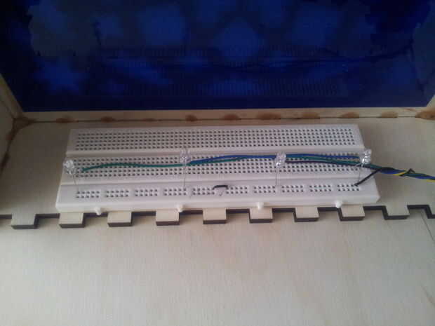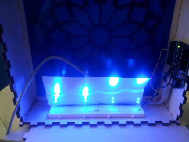 El circuito para este proyecto es sumamente simple. Había conectado 4 leds ultrabright con sus ánodos en paralelo. Los cátodos están conectados al pin 6, 9, 10 y 11, los pines PWM. Normalmente, habría enrutados a un PCB para esto. Pero en el nombre de completar el regalo a tiempo, no hace daño a un protoboard con el cable de puente. También he dejado fuera las resistencias limitantes actuales. Mis razones para esto son, 1. la vuelta de tensión para estos leds azules son unos 3.6V. 2. teniendo en cuenta serán alimentadas por una tensión al azar para replicar el efecto de luz de vela, no creo que dejando de lado la resistencia a reducir notablemente su vida. Grabado un pedazo de papel delante de los leds para servir como un difusor de luz adicional.