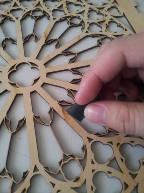 Hubo también importantes oscurecimiento en los radios del patrón por el hollín de la corte. Esto era probablemente debido la cercanía de los dos adyacentes a líneas de corte. De todos modos, una vez conseguidas todas las piezas MDF, nada un poco de lijado (no seguro cómo sabia es MDF de la arena) no eliminar. Después de comprobar, las dos caras de frente no coinciden perfectamente (por suerte no era un show tapón). Creo que fue porque había una leve deformación inicial en la MDF de 3mm.