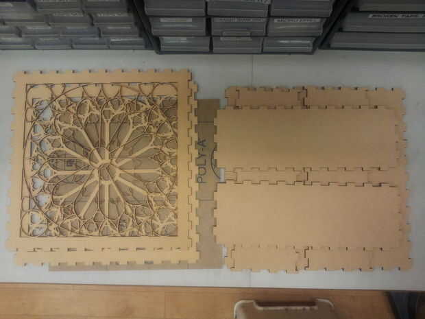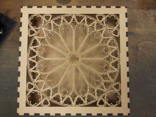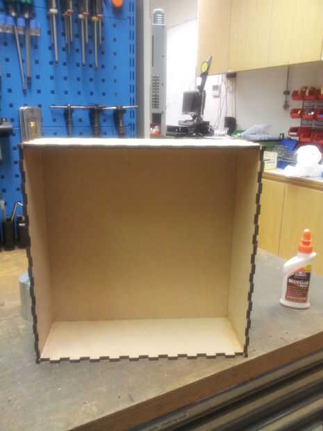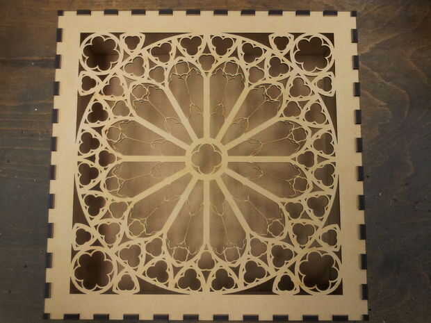Para esta build no había gran Asamblea requerida (una vista explotada de la Asamblea se muestra en la sección de diseño). En total hubo tres grandes paneles de madera (dos caras frontales y una cara posterior), cuatro paneles de madera pequeños (dos para los lados) y dos para la parte superior e inferior y finalmente una hoja de acrílico en forma de cuadrado. He optado por una secuencia de montaje ligeramente diferente de la rosa-ventana-temática-noche-luz.