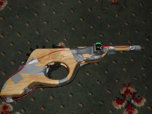 una pistola poco fresca que hice para alrededor de $10. Lanza un pequeño dardo de juguete cerca de 10 pies.