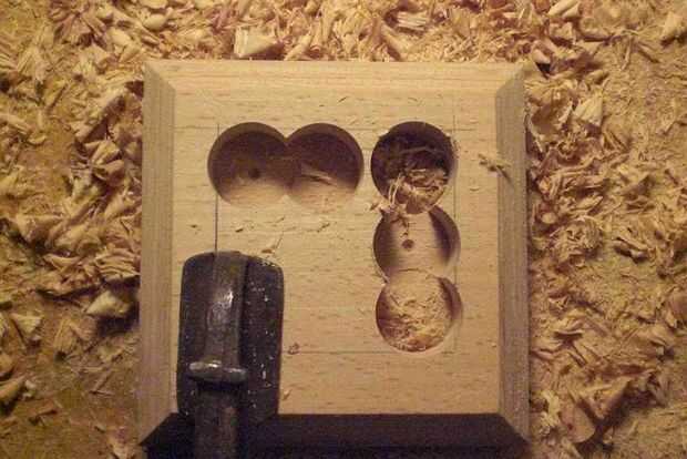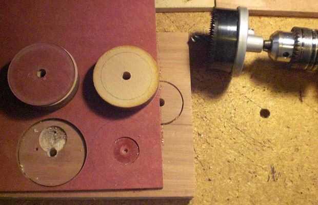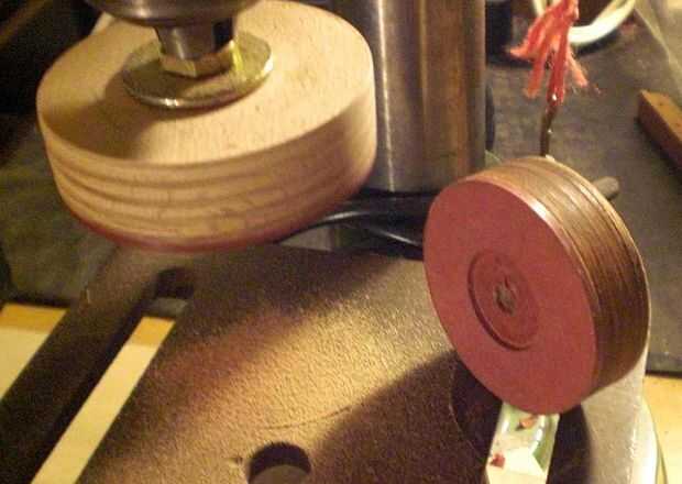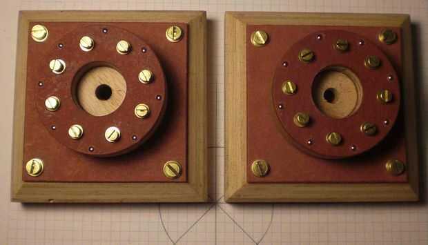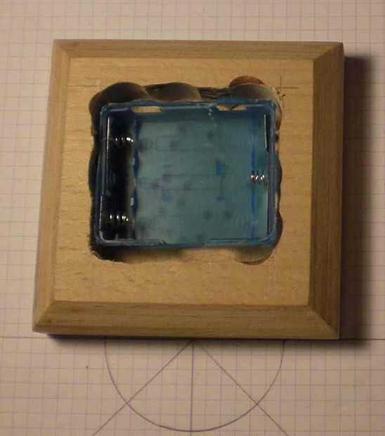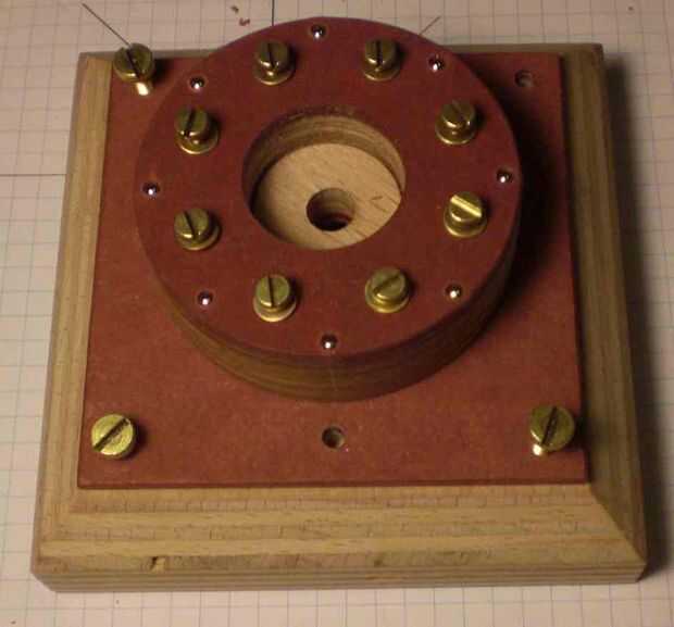 Así que aquí el soporte de la lámpara está hecho de madera contrachapada y vulcanizado de la fibra. En este stand perforé algunos agujeros con un perforador de forstner para mantener el soporte de la batería y un interruptor interior. Para crear un diseño técnico me puse otro anillo de madera contrachapada sobre el que sostiene más tarde la linterna. Este anillo está decorado con algunos tornillos de latón e inoxidable roba pequeñas bolas (diámetro. 2,2 mm). La para los grandes equipos se cierra el batteryholder. Metall todas las piezas han sido pulidas y cubierto con laca zapon.