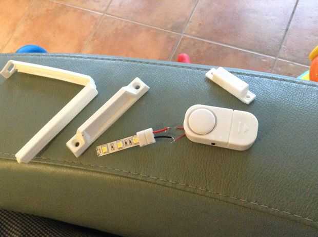 Mi hija y yo recogió algunas de las alarmas de pilas $1/ 90 decibelios desde el almacén del dólar. Rápidamente abrí, cortar los cables al altavoz y asomó fuera de la parte posterior de la unidad. A continuación nos reunimos algunos artículos de la cocina - un clip de bolso de la viruta, un mango sin usar desde una ventana que encontramos en el cajón de basura, un pequeño segmento de cinta led ($5 fuera de eBay para un rollo de 15 pies, siempre tener uno a la mano para tiempos como estos!), alguna cinta y nosotros estamos establecido.