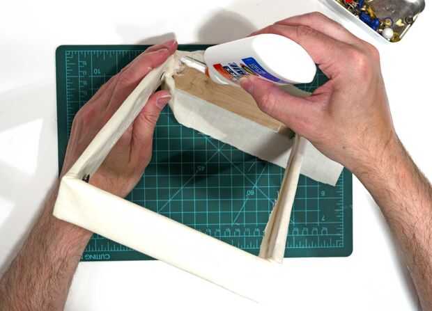 Trabajando a un lado en una extensión de tiempo una capa de blanco pegamento en el interior del marco y tire el paño por la parte exterior y sujételo firmemente con la cola. Puede usar las chinchetas para ayudar a mantenerlo hasta que se seca. Tenga cuidado de no conseguir pegamento sobre cualquier superficie en el exterior.