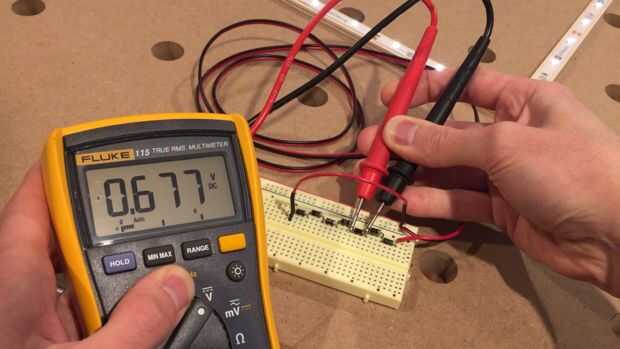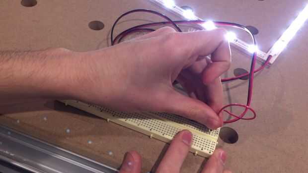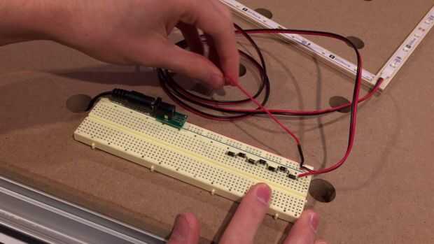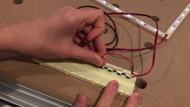 7 x diodos 1N4001 en serie en un protoboard proporcionan 8 nodos con progresivamente disminuyendo la tensión. Cada diodo presenta una caída de voltaje de cerca 0.7V (la fuente de alimentación y tiras de LED son clasificadas a 12V).