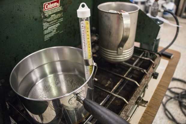 Vierta un paquete de Instamorph en una olla de agua tibia, unos 150 degF. Le dan unos 2 minutos para las pelotillas claras y derretir.