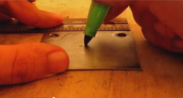 Comencé por quitar el soporte que se fija la luz en el stand de piso común (imagen uno). He trazado la forma de la espalda sobre el acero del desecho y marcado hacia fuera donde el los orificios fueron con marcador permanente (figura dos).