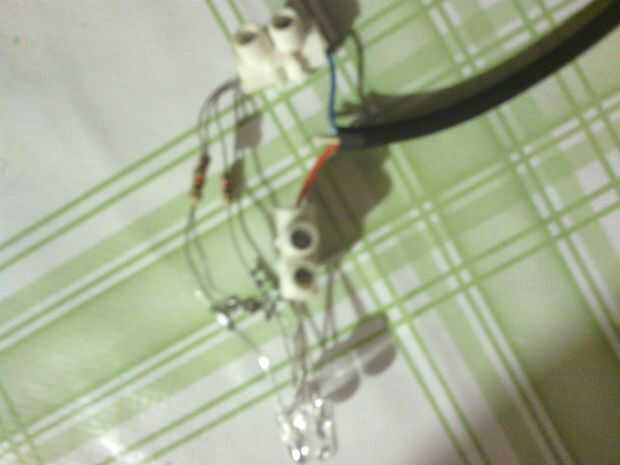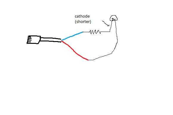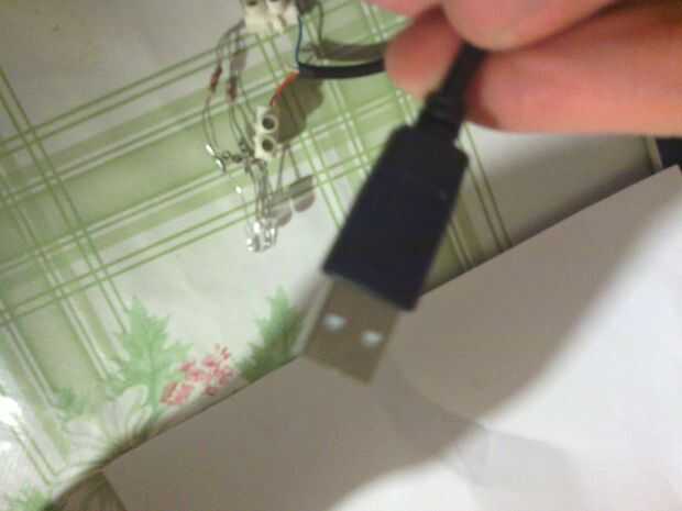 2, entonces la soldadura LED a resistencia (final de una resistencia de cátodo de led, más corta de la pierna) entonces usted soldar otro extremo del resisotor a negro (o azul en mi caso) y ánodo (más) del led al cable rojo USB