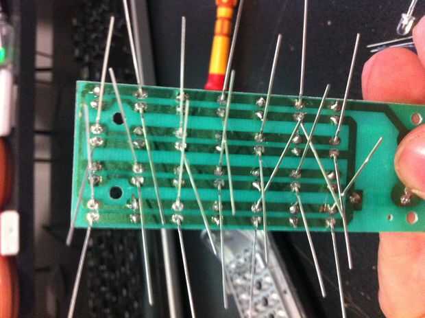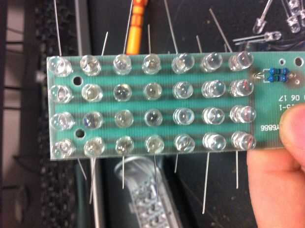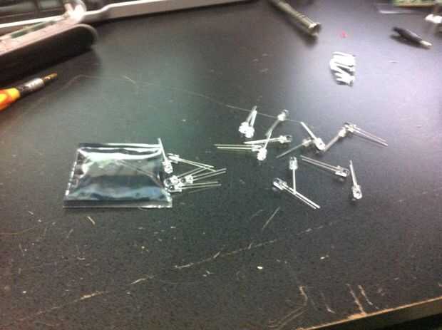 Ahora, abrir sus LEDs de 365nm agarrar 14 de ellos y colocarlos en los espacios disponibles, asegurando por supuesto que la polaridad es correcta. Cada vez que pones una curva en las puntas al lado para que no caiga hacia fuera. Una vez que todos los LED están en el lugar, la Junta, suelde con soldadura fina, asegurándose de que alternar para evitar cualquier posibilidad de daño por calor. Una vez se sueldan todos los LEDs, corte los cables y asegúrese de que las conexiones son correctas.