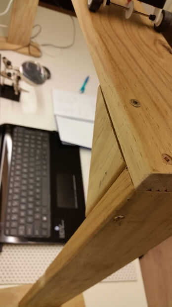 Los tirantes se sujetan firmemente con tornillos según las fotos de arriba. También tienen la Plaza de la unidad por lo que es importante que les de orientación la forma correcta de los lados de 10cm, conectados a la pierna y la parte superior. Tenga cuidado para que agarre la banda de rodadura en la superficie es constante en cada lado. Perfore previamente los orificios para evitar la división de madera y asegúrese que los tornillos no sobresalgan a través de la madera cuando enroscado.