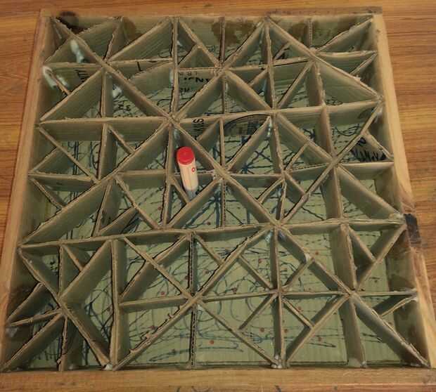 2. Coloque la cartulina en el marco. Tomar un marcador y ponga una marca en el centro de cada triángulo. Este es el lugar donde estará el led. Hacer la marca gruesa y distinta.