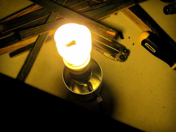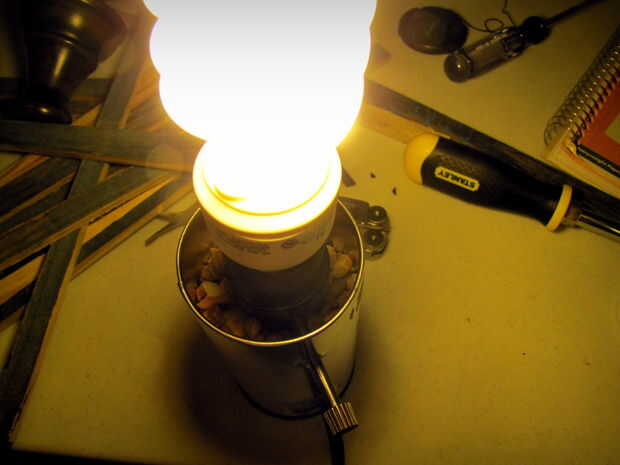Comencé agregando unas tiras de goma alrededor de la abertura del agujero donde recorre el cable de luz para evitar que el filo de la lata de metal de corte en el cable. Después maniobró el cable por el agujero y volver a conectar los cables al enchufe de la luz (Asegúrese de que el cable está desenchufado). Luego une la varilla para el interruptor de la luz y había probado a la luz. Después de encontrar la posición preferida de la toma de luz, me lleno de piedrecitas alrededor de la toma de corriente para mantener la luz en su lugar y proporcionar peso a la base de la lámpara.