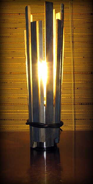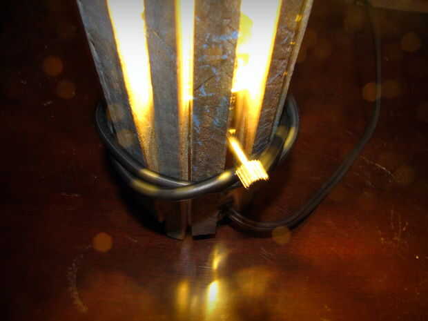 Luego tomó la tira de goma y había atado flojamente en un nudo básico. Comencé a deslizar en las piezas de madera cortada al azar. La altura de las tiras de madera se puede ajustar según sus preferencias personales. Me gusta tener un poco de metal de la lata de té en la parte inferior de la lámpara. Esto creará una lámpara como se muestra en la foto de portada para este instructable.