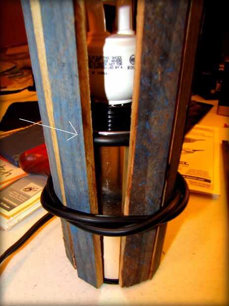 Si desea aumentar la cantidad de luz que esta lámpara se desprender, agregue una tira de goma entre los listones de madera y lata de té en la parte superior (ver la imagen con la flecha que muestra la tira de goma agregada). Esto hará que las tiras hacia el exterior de la curva y dejar que más luz pase entre cada tira. Este método también permite una lámpara más personalizada.