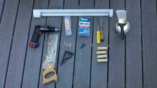 Aquí es tu put it juntos: taladro, Sierra, destornilladores (ambos + y -). Tacos de madera, si usted quiere fijar las juntas, de lo contrario ángulo placas (no mostradas). Soportes de estantes (4), tan decorativos como usted tiene gusto. Ladrillo tornillos para sujetar los soportes del estante. Crece fluorescentes (4). Bloques de madera para montar las luces crecen, porque queremos por su parte, sobresale sobre el borde del tablero (para la luz máxima). Pintura blanca para la parte inferior de los tableros. No mostrado: luz temporizador, cable de extensión, barra de la energía, adhesivos de baldosas y palillo en azulejos del espejo.