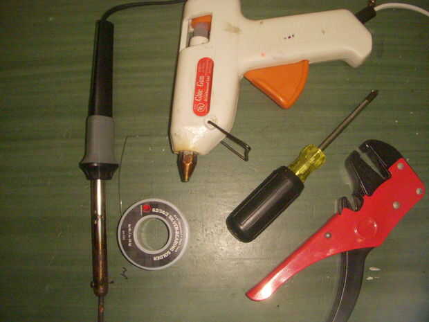 1. amplificador de guitarra 2. iluminación de cátodo frío de computadora con micrófono 3. pistola de soldar con soldadura 4 pistola de pegamento caliente con palo de pegamento caliente 5. alambre stripier/más lindo 6. destornillador
