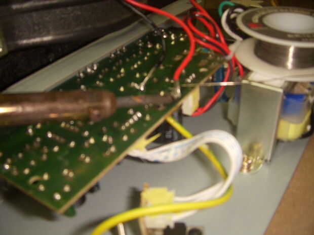 Adivinar donde el poder está en el circuito de amplificador aburrido con los cables rayas toque una protuberancias poco soldado diferente con cada alambre. Bien el amplificador se hunde en (no choque su auto). Que se enciende la luz saben donde al soldado los cables.