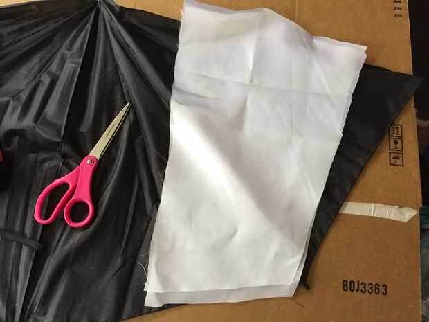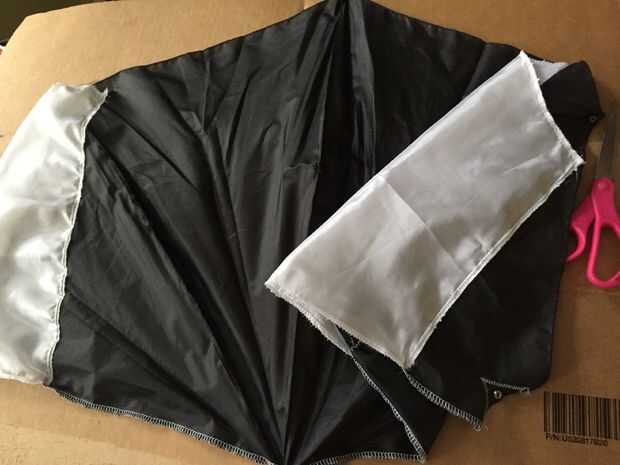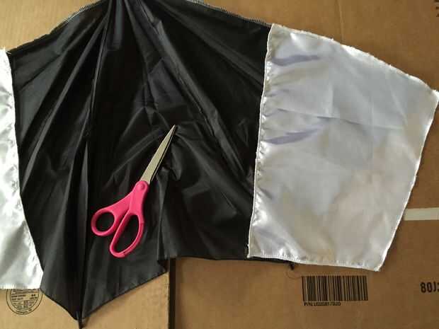 Me corte los paneles por el ojo e hizo registro de marcas en donde tienen que ser cosidos. Tuve algún material blanco satén fino chatarra que he utilizado en vez de la otra mitad de la tela del paraguas.