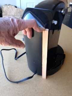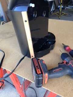 Tercera foto-- Cuidadosamente perforar agujeros para los tornillos en la carcasa exterior de Keurig al lado donde se monta el depósito de agua. Fije la madera con los tornillos. Un día Pinto la madera negro, pero nadie lo ve en el uso normal.