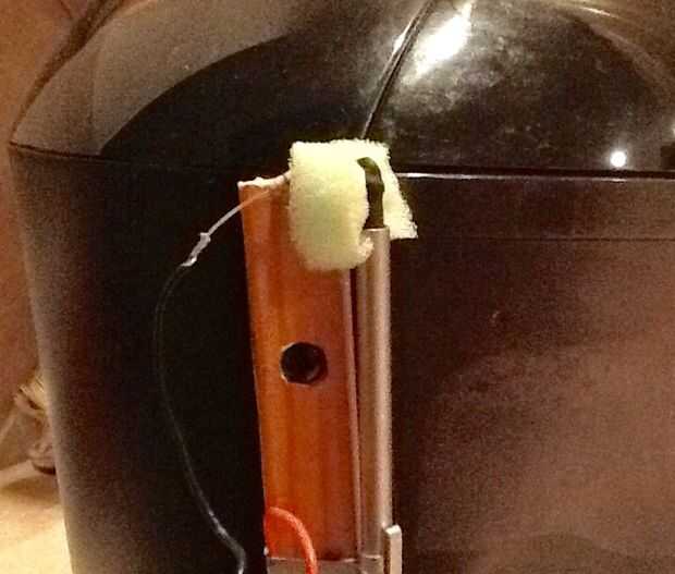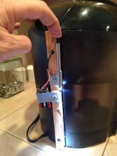 Había planeado usar un interruptor de botón de contacto momentáneo. Sin embargo, el cable #10 se mueve libremente dentro de la linterna. Al principio tuve un poco cinta eléctrica de tela alrededor del alambre desnudo #10 en su extremo superior. A veces se convirtió atascado y la luz se quedó en. La reemplacé con alguna tubería del encogimiento del calor. He añadido algunos de espuma de poliuretano para actuar como un resorte y levantar el punto del cable #10 cuando se quita la presión de los dedos. El circuito se hace con una pequeña presión con los dedos hacia abajo. Lo que se muestra en la foto es justo debajo de la parte posterior de la superficie en la Keurig. Me alcance en la parte superior con un dedo y presione suavemente hacia abajo. Ver la segunda foto. Cuando yo saque mi dedo, la luz LED se apaga. (La segunda foto fue tomada antes de la cinta del paño fue quitada y la espuma de poliuretano fue agregada).