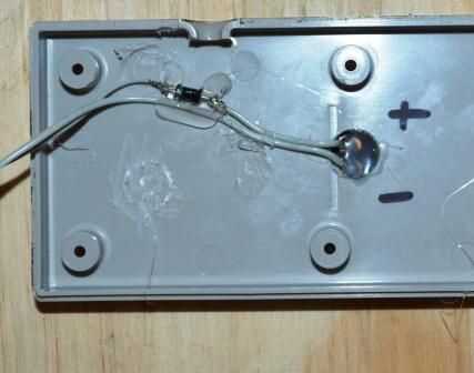 3. Añadir un diodo en el punto de soldadura positivo en el panel solar. El diodo tendrá que ser conectado con el extremo positivo soldamos al punto de soldadura positivo. Ver imagen de abajo. Esto asegurará que las baterías no perder energía cuando está oscuro.
