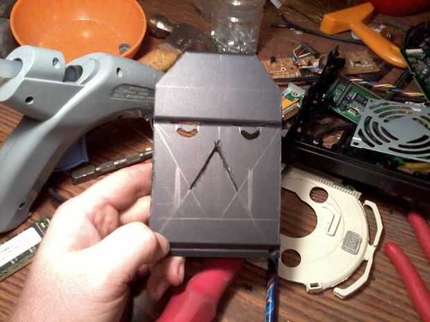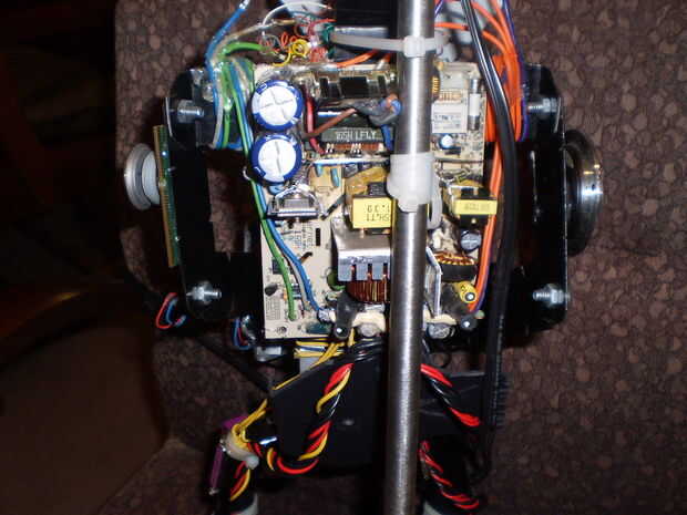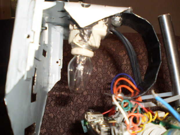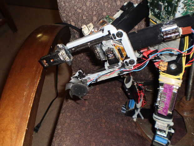 Envuelve los cables alrededor de todo, y corta hasta circuitos cosas en boquetes. Su pecho es el circuito y alambre bobinado estatores de una unidad de disquete. Guardé los circuitos de suministro de energía intacta y atado a su espalda, dejando los cables serpiente alrededor de sus miembros.