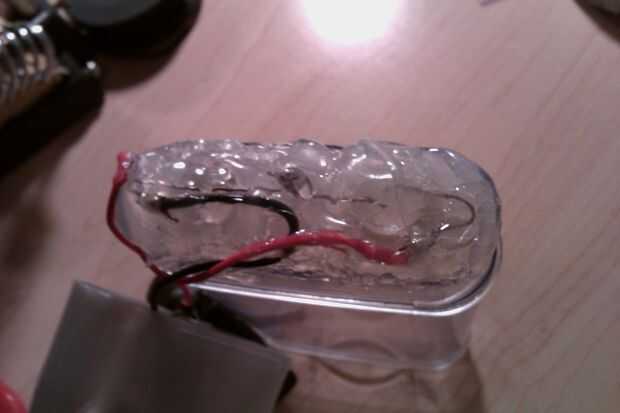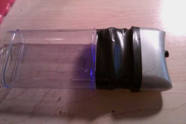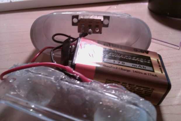 Conecte la batería de 9v a los clips. Flip en el interruptor. Genial funciona, si no comprobar sus conexiones. Pegue el interruptor en la parte superior la tapa. Coloque la batería dentro de la tapa y remeter los hilos como bien. Toma un pedazo largo de cinta aislante y cinta alrededor de la parte inferior de la tapa en la parte superior del cuerpo. Si su tapa puede caber todo dentro, bueno para usted, necesita menos cinta.