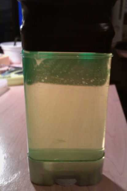 Vierta suficiente agua para llenar el interior del desodorante en la parte superior. Retirar el interior de su marcador y soltar unos 10 gotas del líquido dentro del agua que se encuentra en el desodorante.