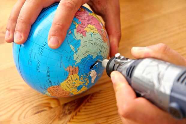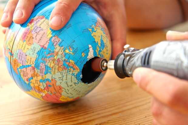 Coloque una 1/8" corte poco la dremel. Insertar la broca a través de toda la izquierda del globo están, su forma de trabajo hacia fuera para el contorno de lápiz que dibujaras. Seguir cortar el interior de la línea con la broca de corte hasta que haya quitado la pieza del círculo del globo que había esbozado.