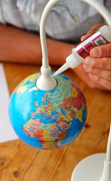 Para esta aplicación en particular usé un pegamento relativamente fino para que no acaben con una gota de pegamento en el producto terminado. También funciona bien si tienes una super cola con un pequeño aplicador que le permitirá colocar una fina capa de pegamento entre el mundo y cabeza de la lámpara. Aplique pegamento en toda la circunferencia del agujero circular en la parte superior del globo.
